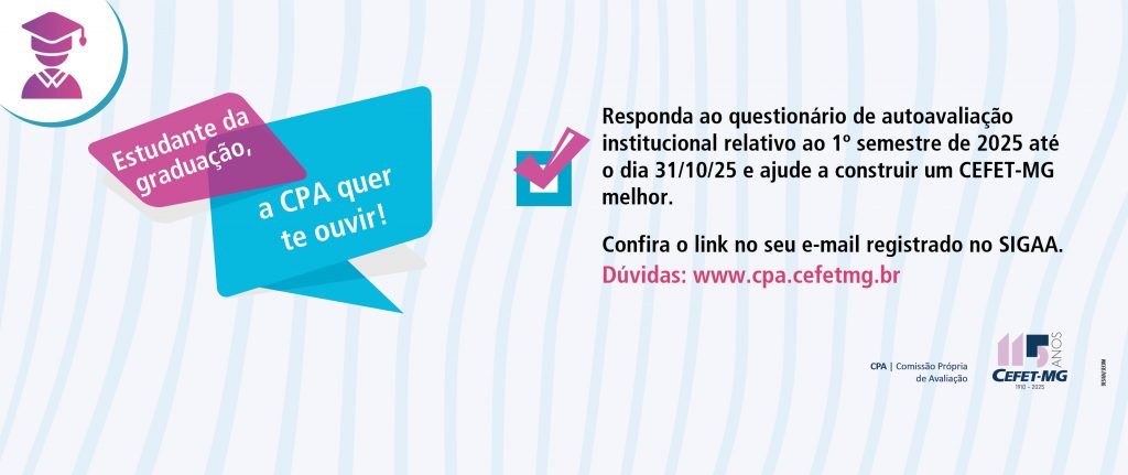 Quem optar por receber o certificado de participação dessa avaliação, com carga horária de duas horas, deverá acompanhar a página da CPA (https://www.cpa.cefetmg.br/certificados/), onde os certificados estarão disponíveis até 30/11/2025.